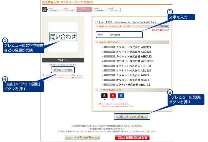 注文情報入力画面で作成したい文字を入力し、書体・インク色などを指定します。
